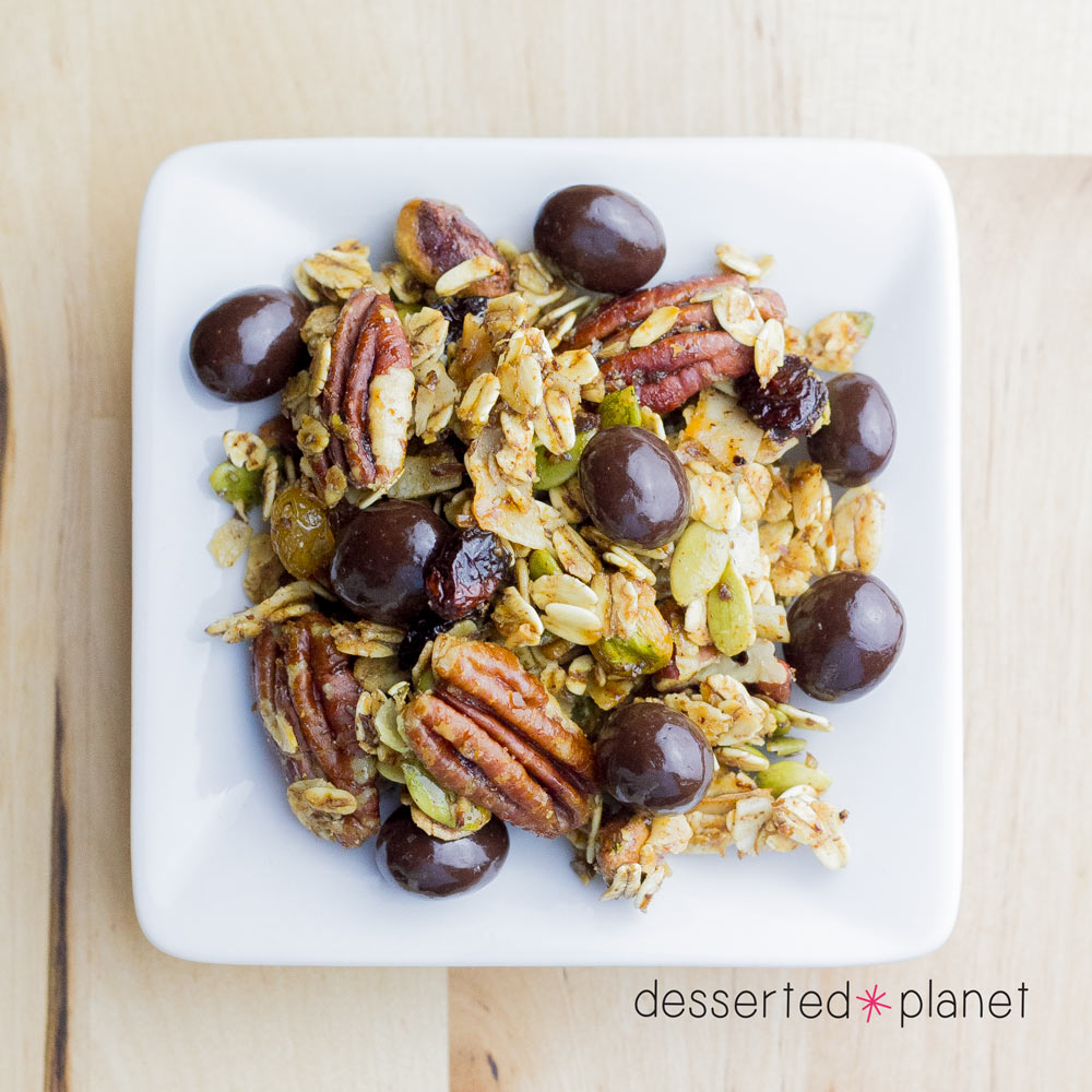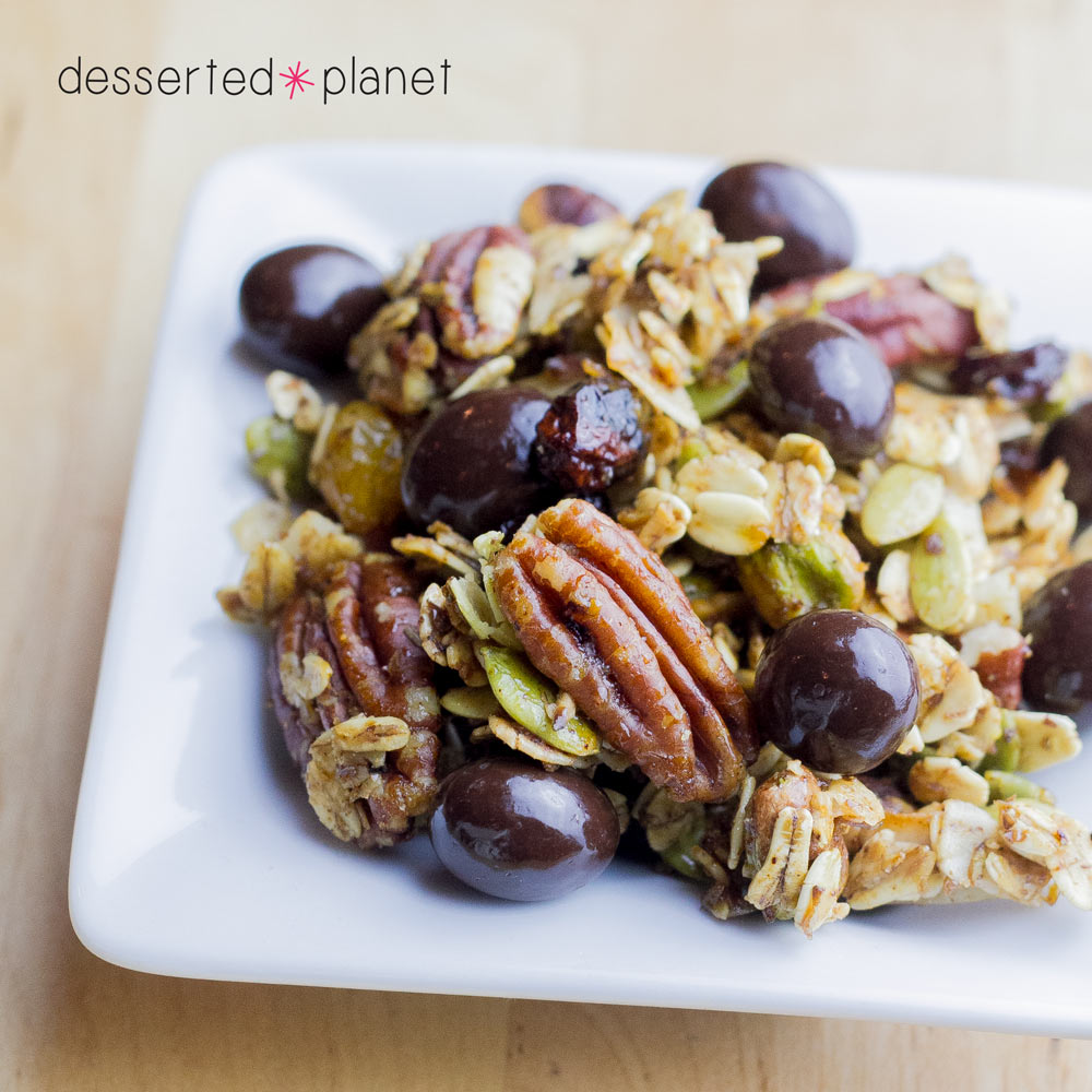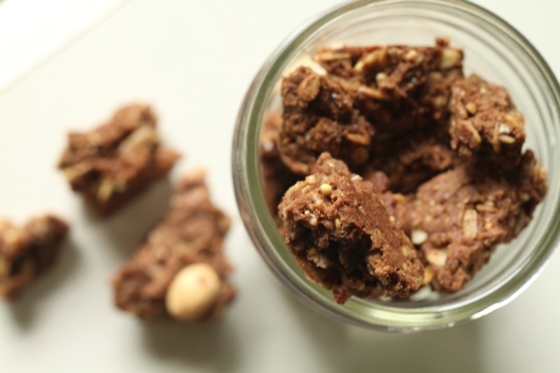 - After an hour break the granola up into clusters and stir in chocolate covered coffee beans or dark chocolate chunks.