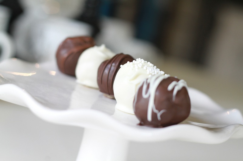 While dough is chilling, melt chocolate wafers in microwave in 20-second intervals, stirring each time. When chocolate is completely melted, get dough out of fridge, shape into 1-inch balls and dip in chocolate. Having something like this, helps alot. Place on foil to harden. Drizzle with chocolate or decorate with sprinkles, sugar, etc.