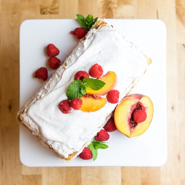 So while not the healthiest dessert due to the sugar in the graham crackers and whipped cream, albeit a small amount, it is an upgrade from my old recipe for sure! And we loved it! The graham crackers get nice and soft and “cake-like” after sitting overnight, sandwiched between the whipped cream. And the raspberry/peach combo is SO good. Simple, delicious and utilizes the last of those yummy summer fruits!