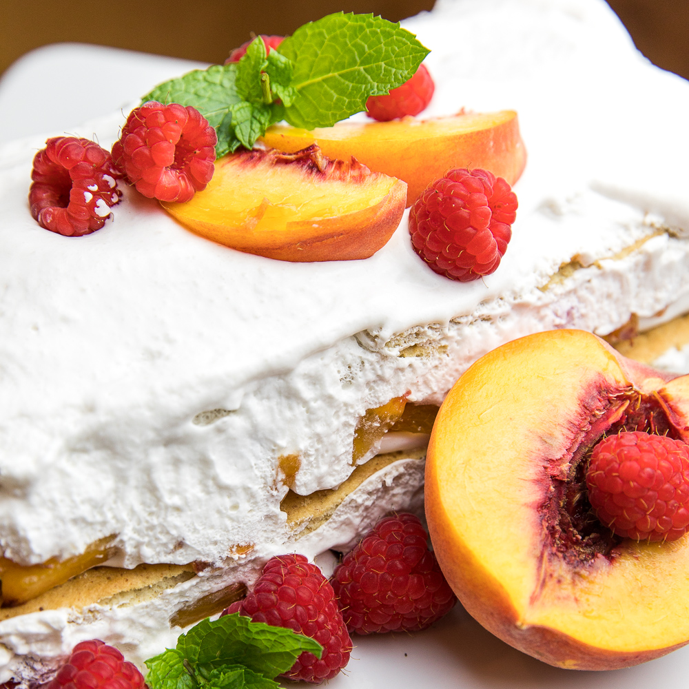 - Cover the graham crackers in another layer of whipped cram and sprinkle the whipped cream with half of the raspberries and half of the peaches.
