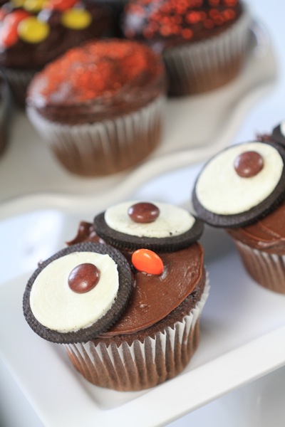 - Now frost the cupcake with a knife and again, using a toothpick, make "ears" for the owl. Place two of the Oreo eyes on the cupcake and push an orange Reese's Pieces sideways into the frosting for the beak.
