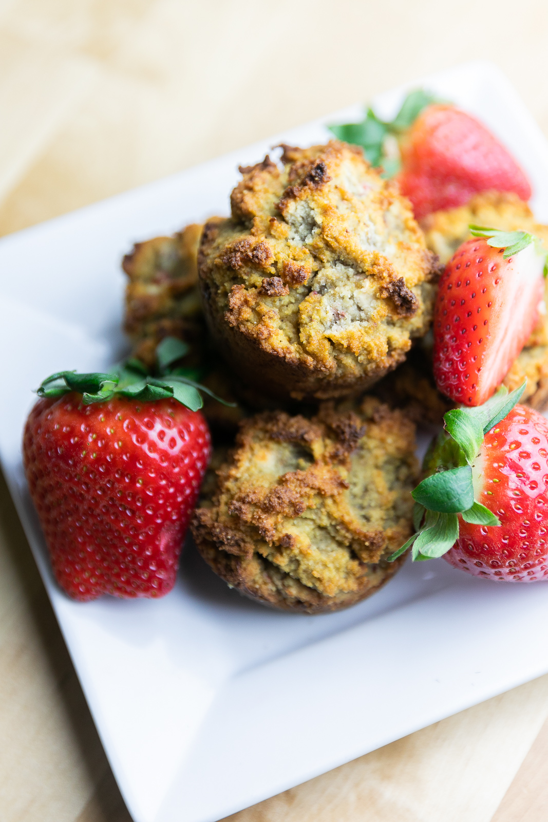 They are a super moist, almond flour muffin…so no gluten (obviously) but also no sugar, no oil, no dairy…100% vegan/plant-based AND Keto AND out-of-this-world yummy! I used freeze-dried strawberries to avoid the issue of too much moisture in the batter and love the little bits of chewy strawberry in every bite. And the almond extract sends it over the top.