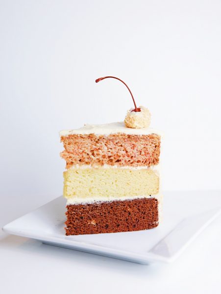 For the cake, I tripled this recipe and split it into thirds. I left 1/3 vanilla, added about 2 cups of strawberry puree to the other 1/3 and then 1/3 cup of cocoa powder and a touch of agave to the last 1/3. I know it’s not technically how you should make three different flavors of cake but I was looking for efficiency here, ok?? 😉 And I used this recipe from my blog for the buttercream–just subbed vegan ingredients!