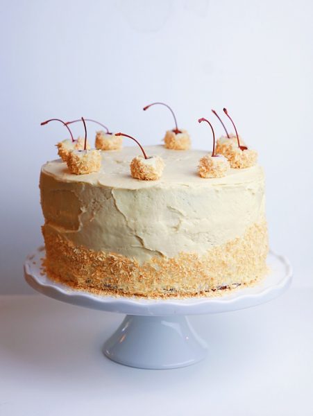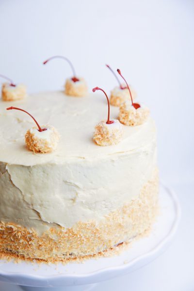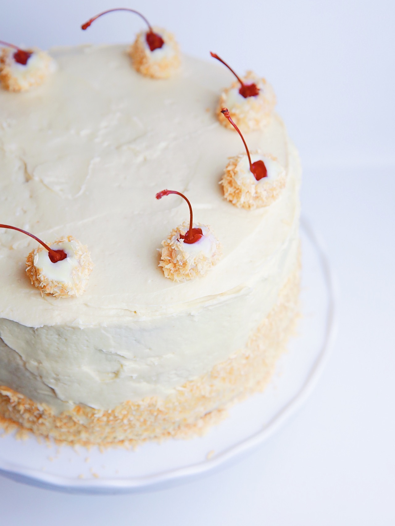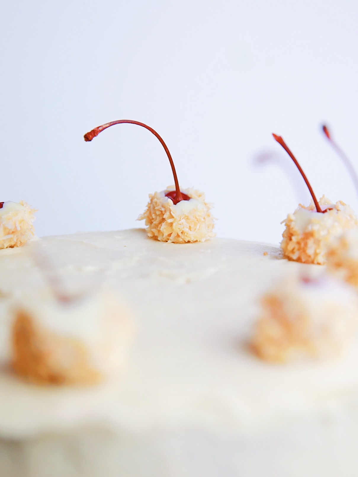 I let her go ahead and tell me what she wanted and she decided on strawberry, chocolate and vanilla cake with vanilla buttercream icing. She had also seen this cake on my blog and wanted it to look like this on the outside with the dipped cherries and toasted coconut.